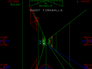 There are, however, two stages to get through before you get to grips with the Death Star. First, the player has to fight off imperial TIE fighters, which are not exactly blessed with all round vision, on the approaches to Darth Vader’s spaceus stationus horribilus. The wheezy ne’er do well pops up quite a bit during these dogfights, and forms one of the many cheats in the game: if you shoot him thirty times, you recieve either 27 or 255 shields, depending upon the version of the game you are playing. This is handy, as you only start with three, and destroying the Death Star itself only rewards you with one.